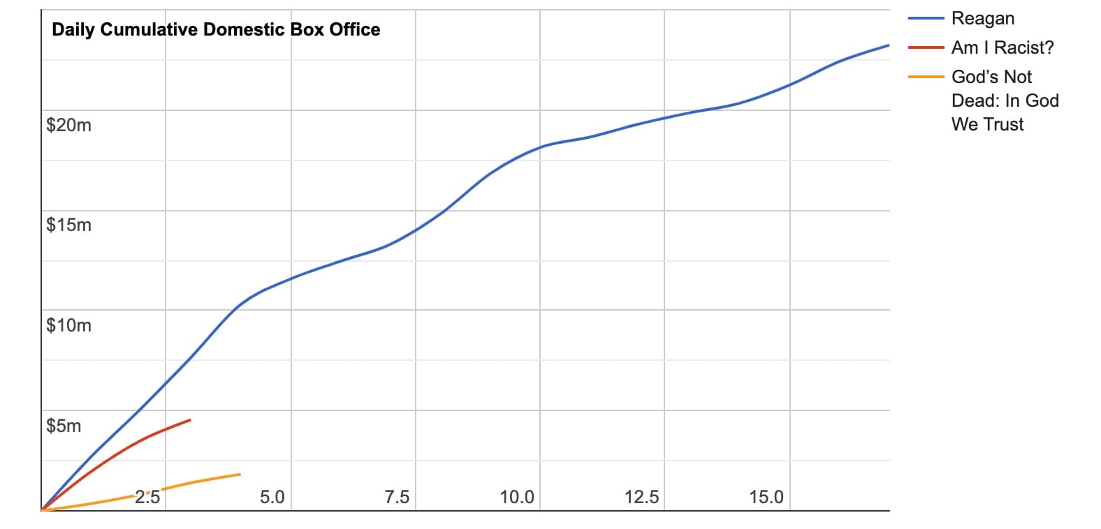Reagan has done a bit better in "totals" but when you notice that it opened in almost twice the amount of screens (Reagan's 2770 screens to Am I Racist's 1517), it makes Am I Racist look far better. On opening weekend, Reagan made $7.6 mil when Am I Racist made $4.5 million. This means that Reagan should have opened with almost twice the box office of Am I Racist (it should have made $8.2 mil), but this did not happen. This means that Am I Racist potentially could make as much as Reagan ($23 mil) in 3-weeks-time, and more.