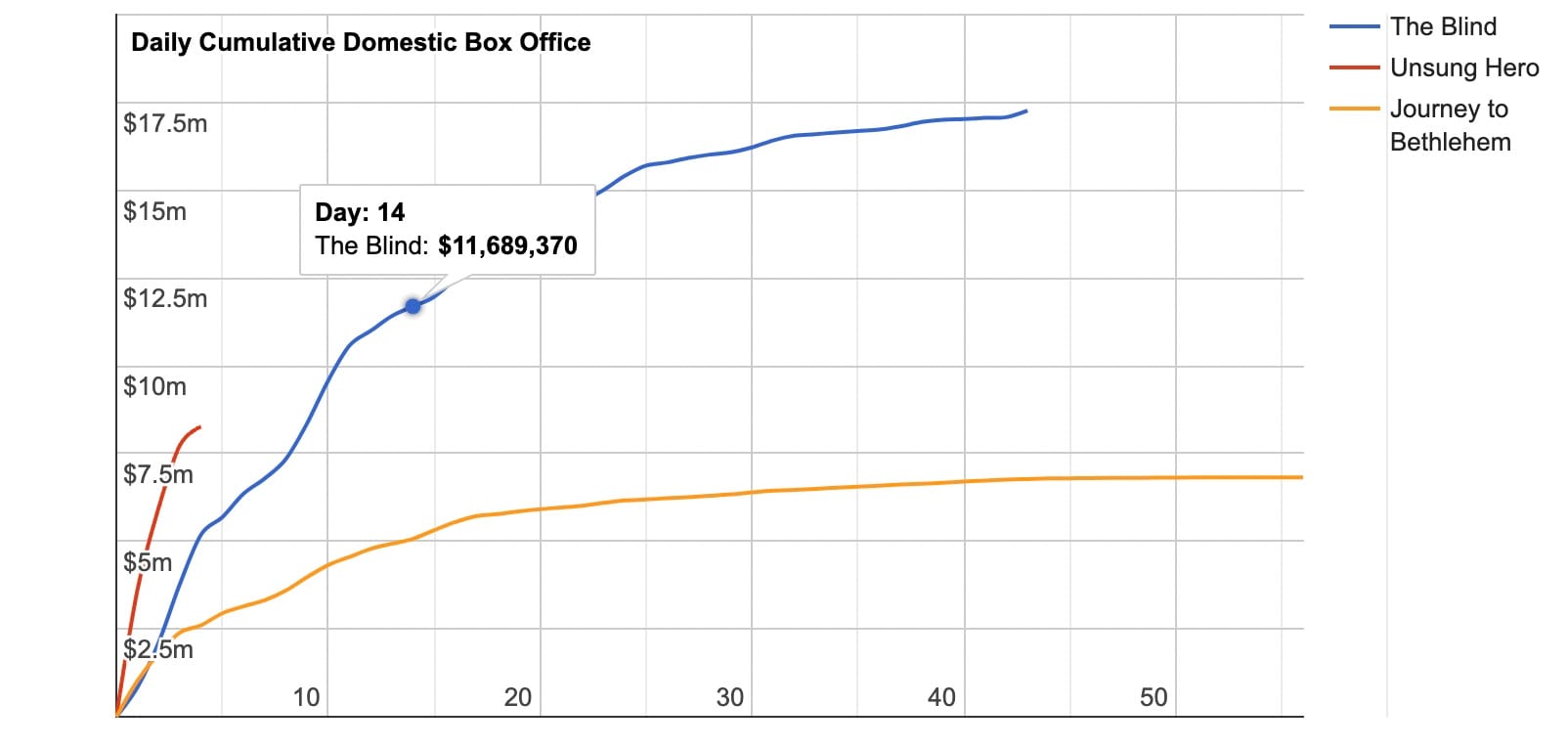 Unsung is still only four days in, so their red line going straight up is still small, but the upward trajectory means it will likely make more money that both of these other films. As I highlighted The Blind on the two week mark (Day 14) below, you can see that it made $11.6 million by this time, but I will bet you that Unsung will end up doing from $14-17 million by that time. Give it 50-60 days and it will start leveling out but will do very well.